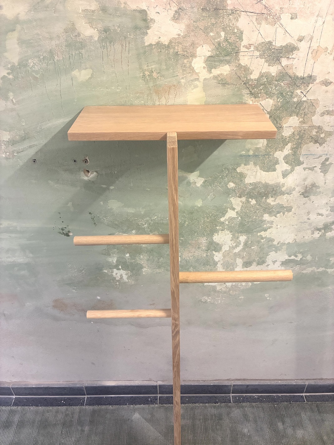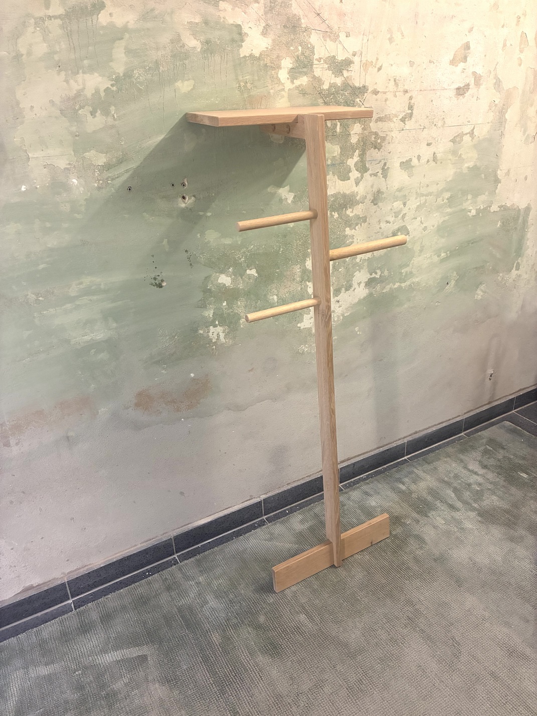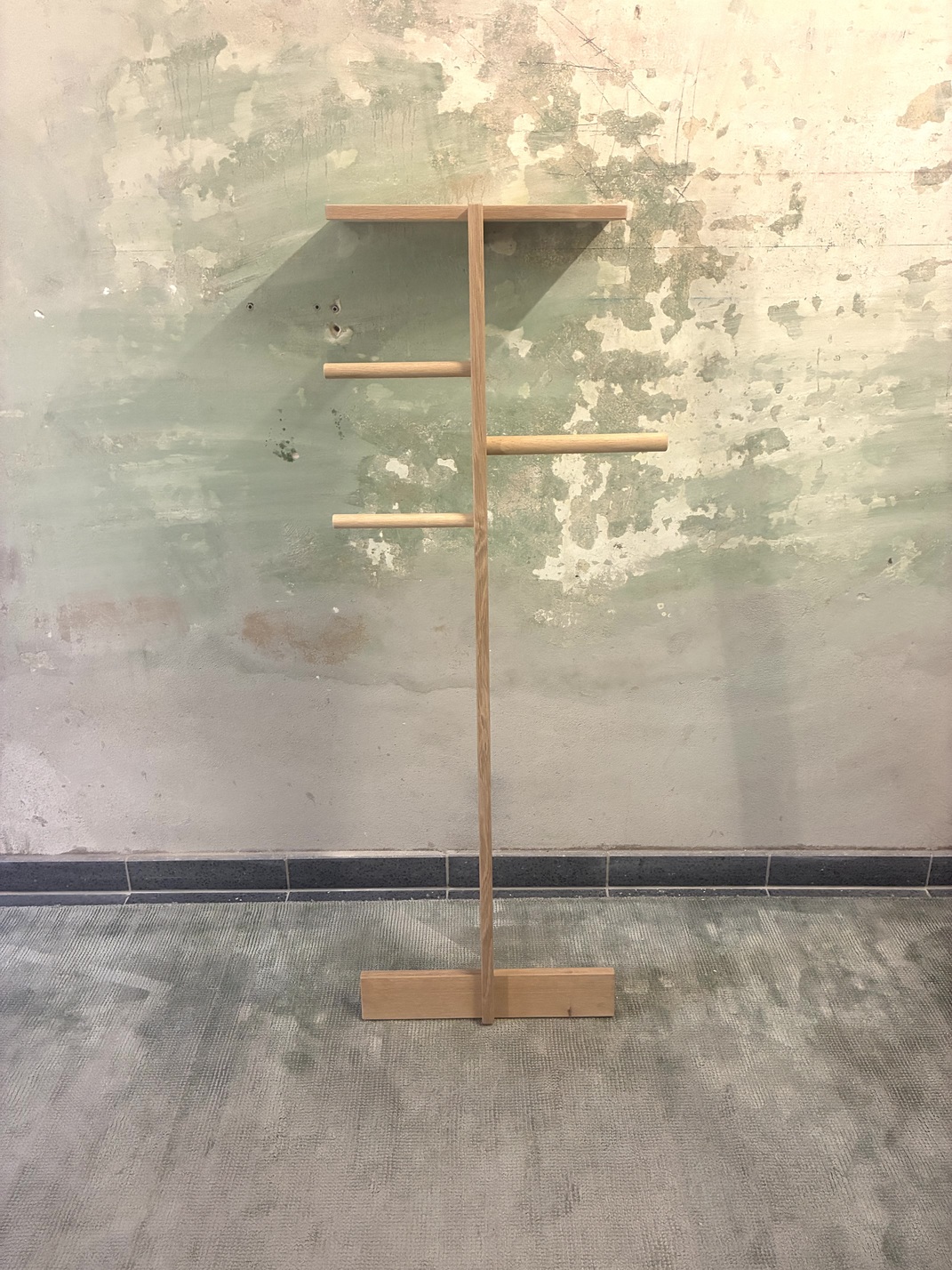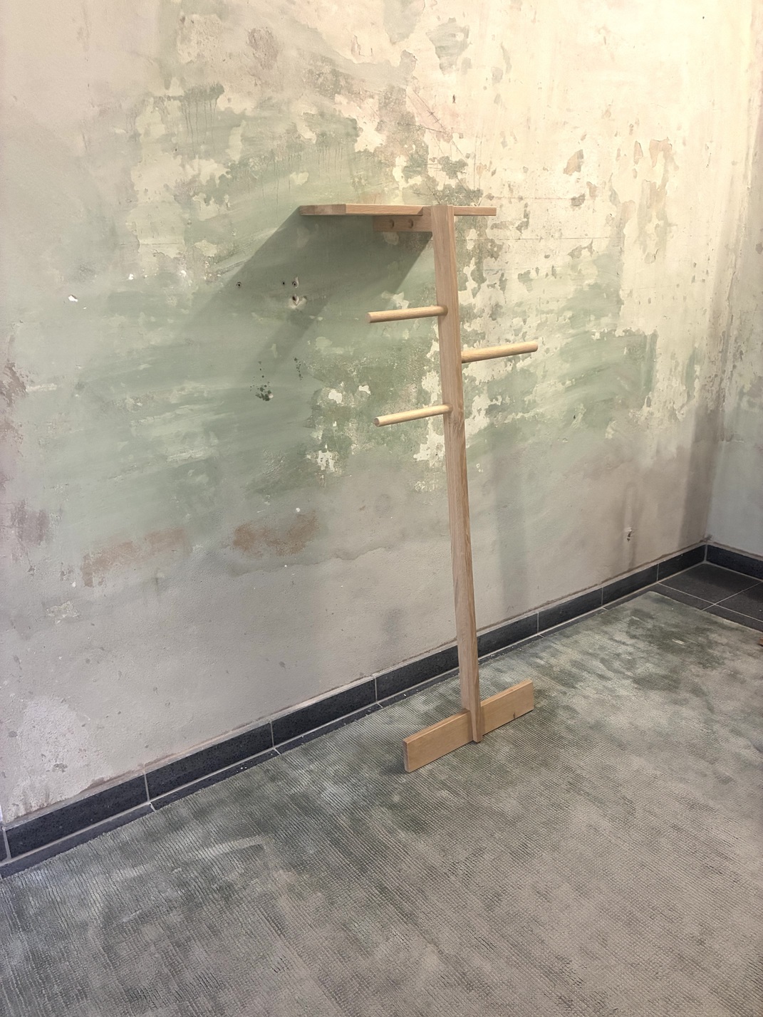 Wooden clothes ladder – The ladders lean freely against the wall.