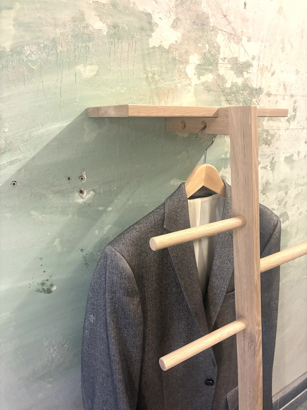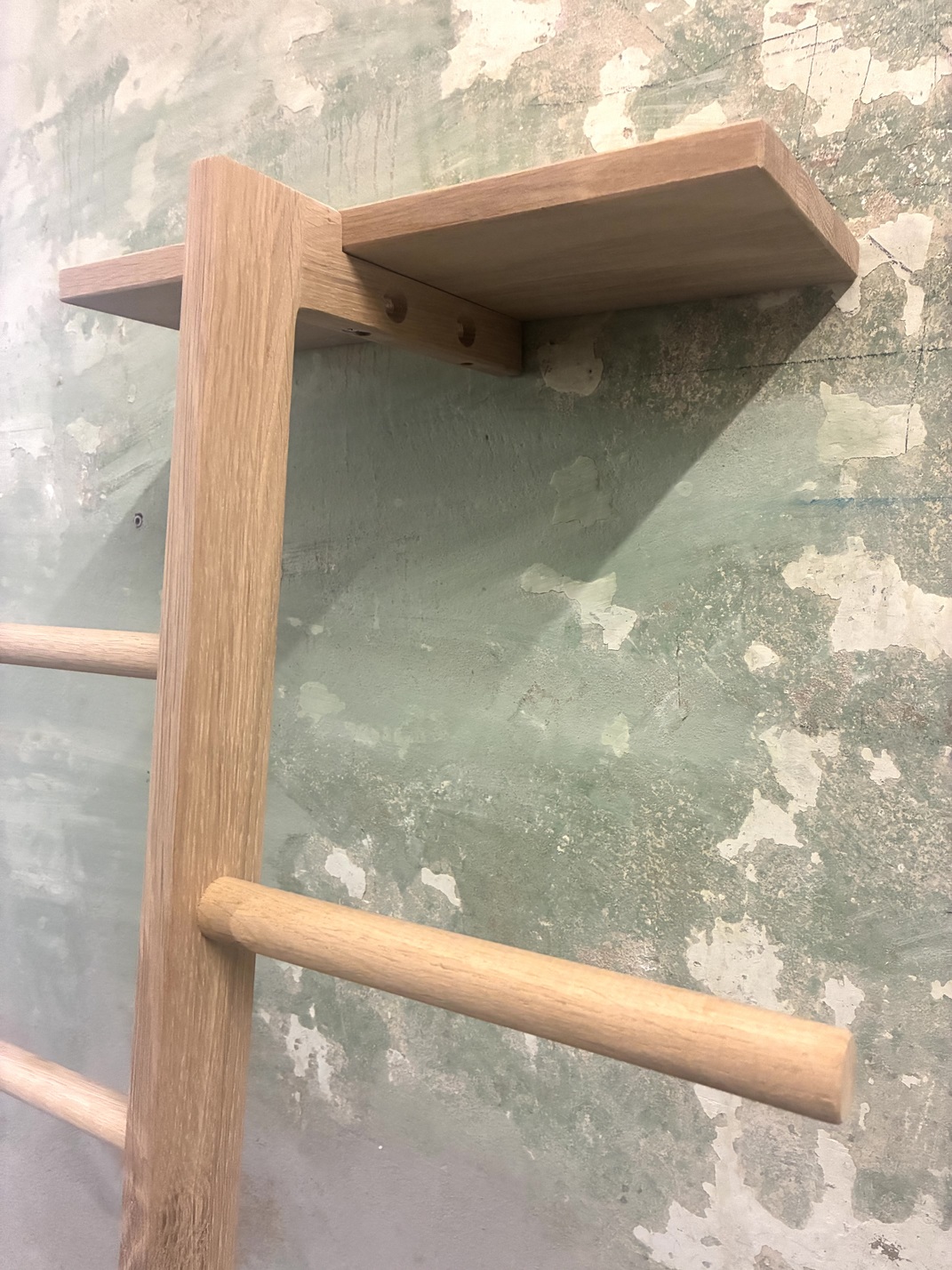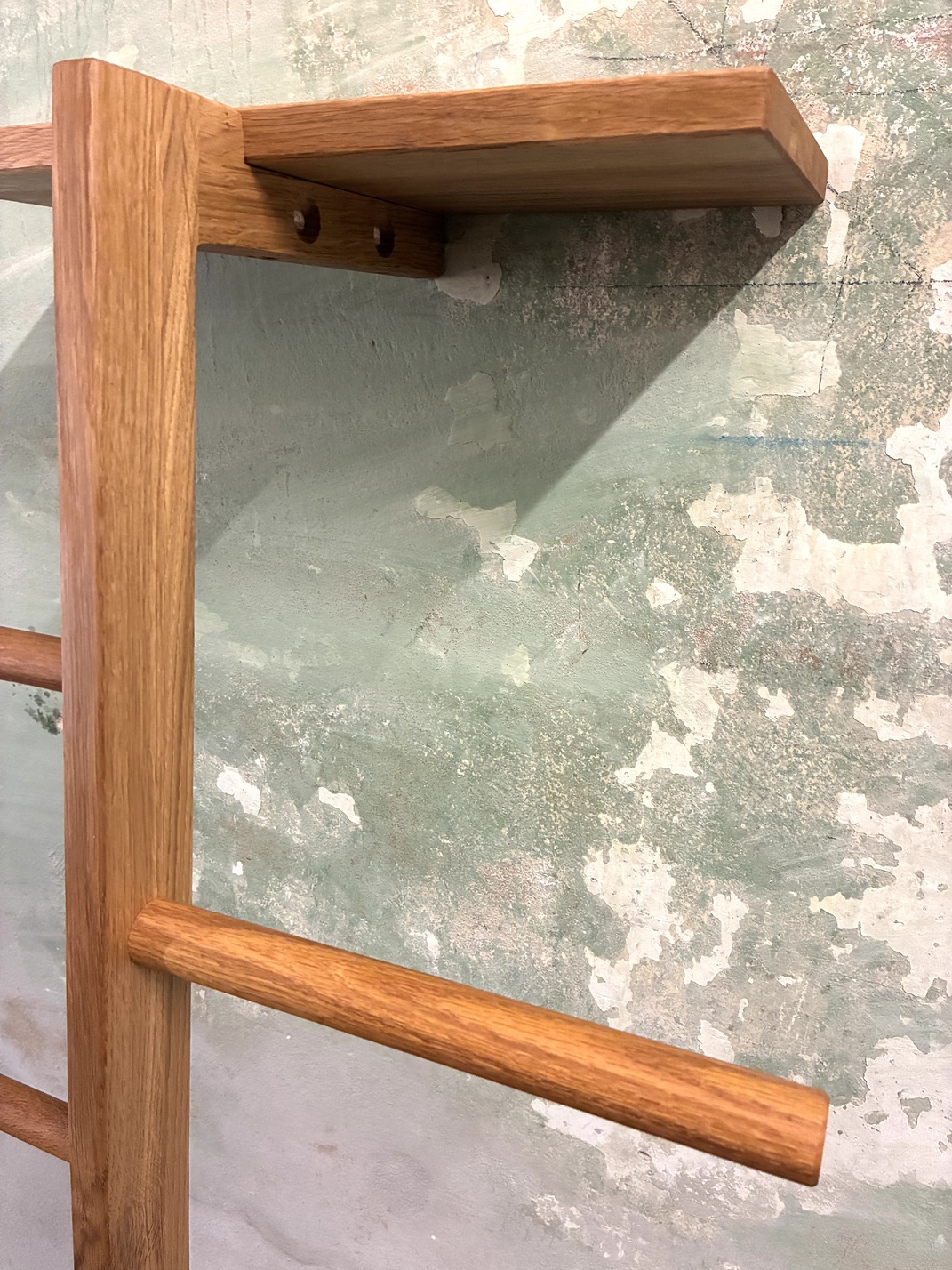 Holz Kleiderleiter – Die Leitern lehnen sich frei an die Wand.